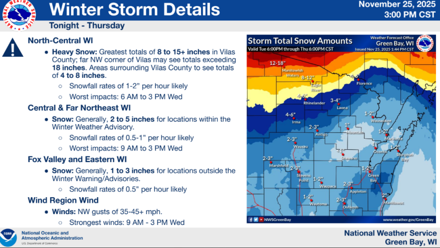 “We've got the pretty tight gradient where we could have 18+ inches up in northwestern Vilas down to maybe 8-12 around Eagle River,” said Gus Kaiser with the National Weather Service Green Bay. “That falls off more in the four-to-eight-inch range for much of Oneida, northern Forest and Florence counties. Then you get a little further south, a little farther away from the lake effect, it's more where you see that blanket two-to-five-inch range.”